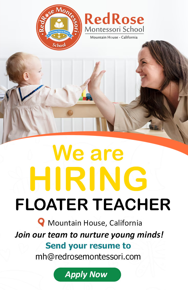 RedRose Montessori Preschool in Mountain House, CA is looking for an experienced and self-motivated Infant Floater Teacher (6 Weeks & 24 Months). We prefer professional and long-term commitment candidates with a good understanding of the Montessori philosophy and love of early childhood education.